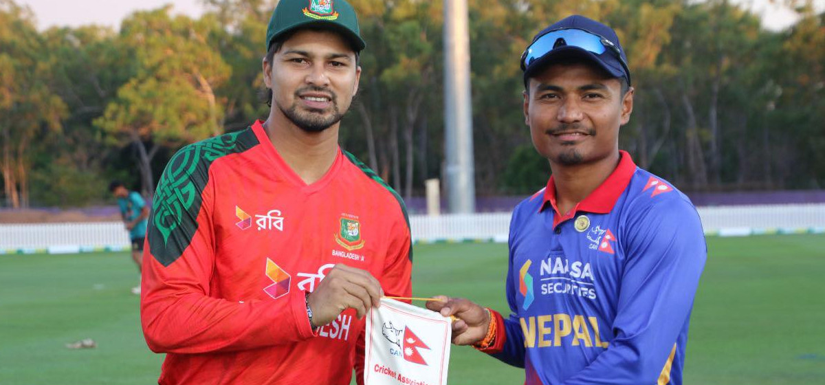 टि–२० विश्वकप छनोटको तयारीमा रहेको नेपाली राष्ट्रिय टोलीले आज अस्ट्रेलियामा बांग्लादेश ‘ए’को सामना गरिरहेको छ। अस्ट्रेलियाको नर्दन टेरिटोरीमा टप एण्ड टी–२० सिरिजको आफ्नो दोस्रो खेलमा नेपालले बांग्लादेश ‘ए’सँग खेलिरहेको हो।