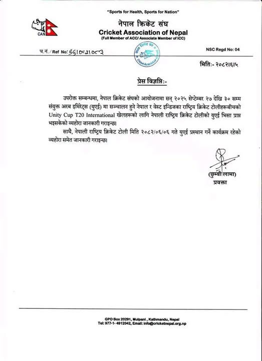 निर्धारित तालिकाअनुसार वेस्ट इन्डिजविरुद्ध हुने तीन ट्वान्टी–२० शृंखला खेल्न नेपाली टोली शुक्रबार बिहान यूएई जाने तालिका थियो । तर भिसा नआएकाले नेपाली टोली रोकिएको थियो । जेन–जी प्रदर्शनपछि नयाँ सरकार बनेयता यूएईले नेपालीहरुका लागि पर्यटक भिसा र कामदार भिसा दुबैमा रोक लगाएको छ ।