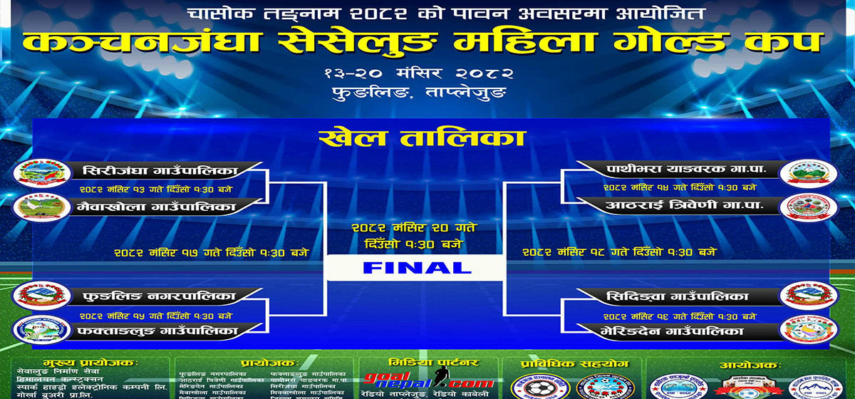 ताप्लेजुङको फुङलिङमा मंसिर १३ गतेदेखि हुने कञ्चनजंघा सेसेलुङ महिला गोल्डकप प्रतियोगिताको खेल तालिका सार्वजनिक भएको छ।