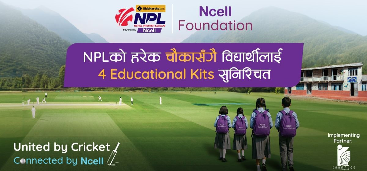 एनसेल फाउन्डेसनले नेपाल प्रिमियर लिग (एनपीएल) सिजन २ का प्रत्येक चौका वापत ग्रामीण र दुर्गम क्षेत्रका सामुदायिक विद्यालयमा अध्ययनरत विद्यार्थीलाई ४ वटा शैक्षिक सामग्री प्रदान घोषणा गरेको छ।