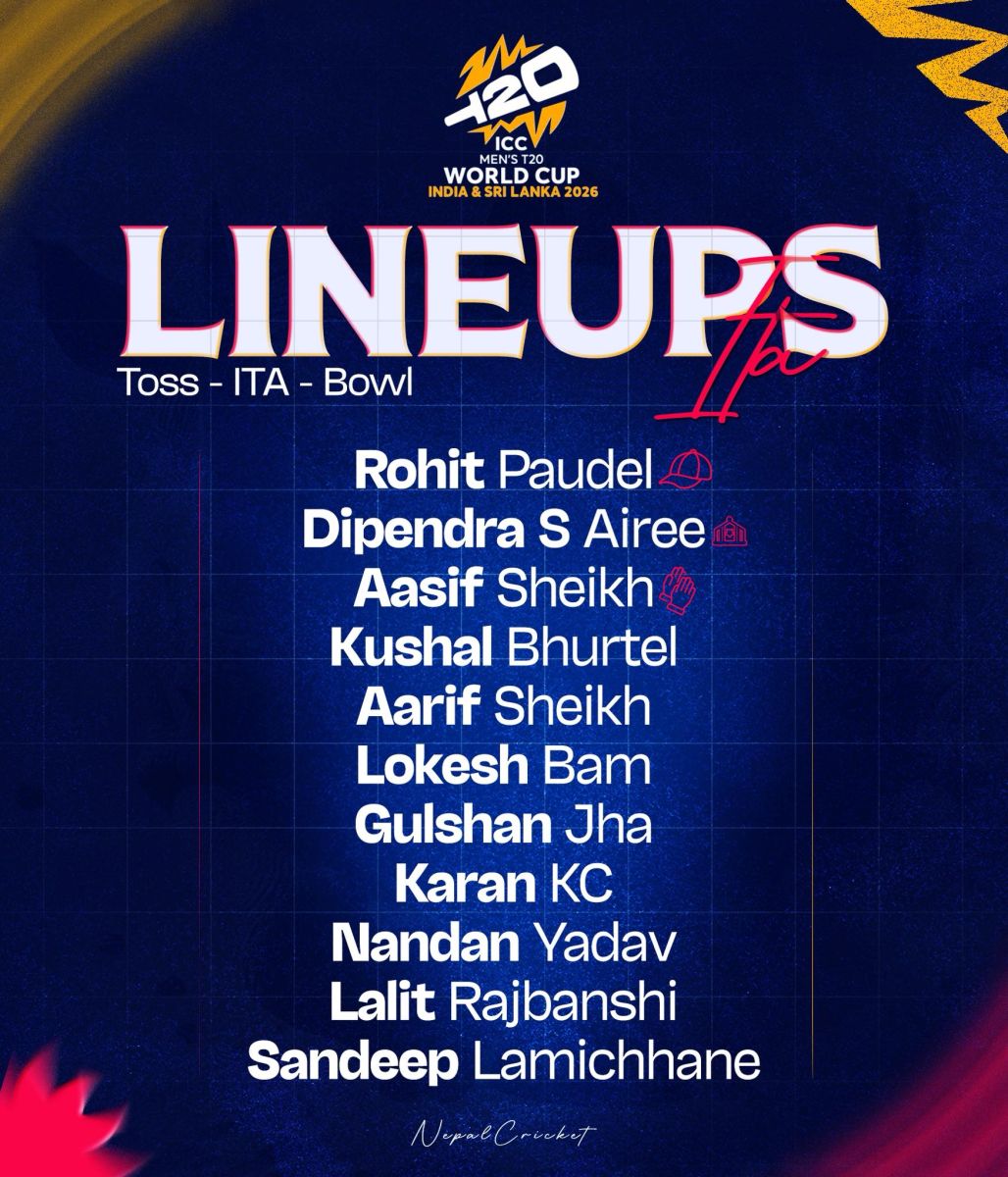 आजको खेलमा कप्तान रोहित पौडेलको नेतृत्वमा मैदान उत्रिएको नेपाली टोलीको ब्याटिङ र बलिङ लाइनअप सन्तुलित देखिएको छ।