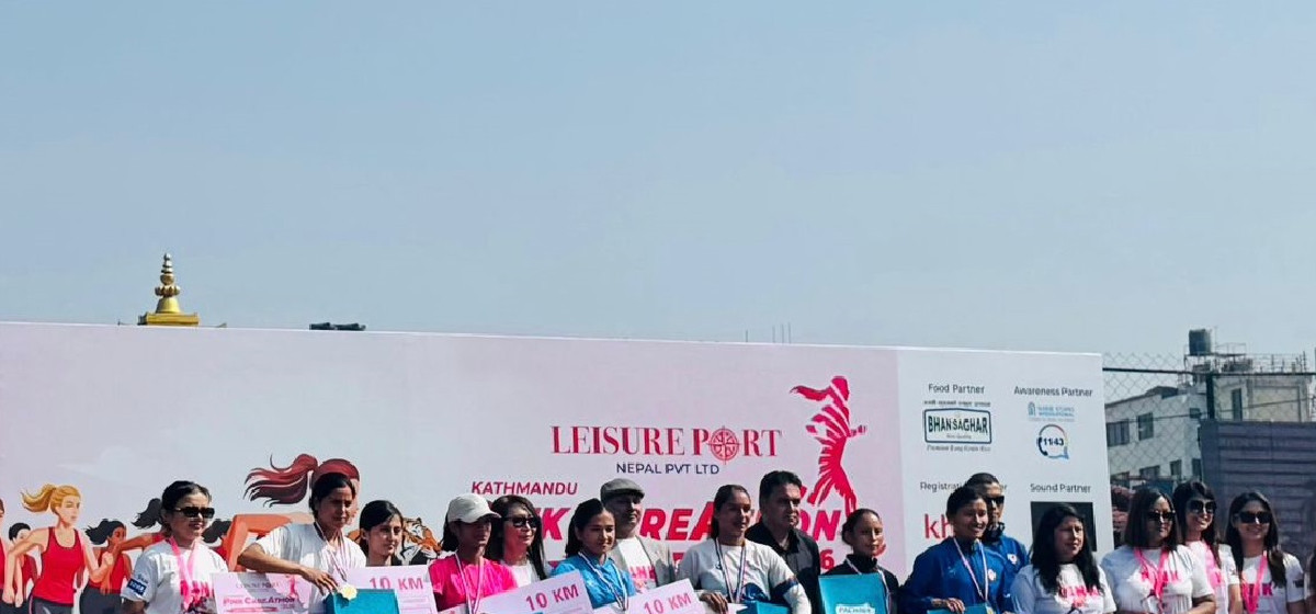 महिला सशक्तीकरण तथा स्तन क्यान्सरसम्बन्धी सचेतना अभिवृद्धि गर्ने उद्देश्यसहितको काठमाडौँ पिंक केयराथन शनिबार जावलाखेलस्थित फुटबल मैदानमा सम्पन्न भएको छ।