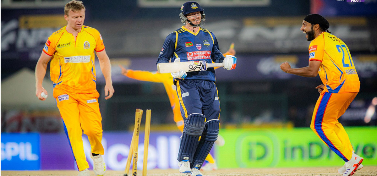 यसपल्ट सुदूरपश्चिमले एकपक्षीय रूपमा नै जित निकाल्यो, त्यो पनि ३५ बलअगावै। विराटनगर पहिलो क्वालिफायरमा मंगलबार सुदूरपश्चिमसँग ७७ रनको फराकिलो हार सामना गर्न बाध्य भयो। बलियो पक्ष मानिएको विराटनगरको आक्रामक शीर्ष क्रमको ब्याटिङ नै धराशयी बन्यो। यससँगै सुदूरपश्चिमले पछिल्लो लज्जास्पद हारको बदला लियो। एकपल्ट फेरि शीर्ष क्रम चल्न नसक्दा विराटनगर असफल भयो। विराटनगरका टिम डाइरेक्टर दीपेन्द्र चौधरीले पनि तीन ब्याटर छिटै आउट भएसँगै खेलमा असर परेको बताए। ‘छिट्टै तीन विकेट गयो। त्यसले नै खेलमा असर पर्यो। विदेशी खेलाडी नै शीर्ष क्रममा छन्। उनीहरू छिट्टै गएपछि फर्कन नै सकेनौं,’ डाइरेक्टर चौधरीले भने, ‘शीर्ष क्रममा नै निर्भर पर्ने अवस्था सुधार गर्ने प्रयास भए पनि सफल भएनौं। आगामी खेलमा सुधार गर्छौं।’