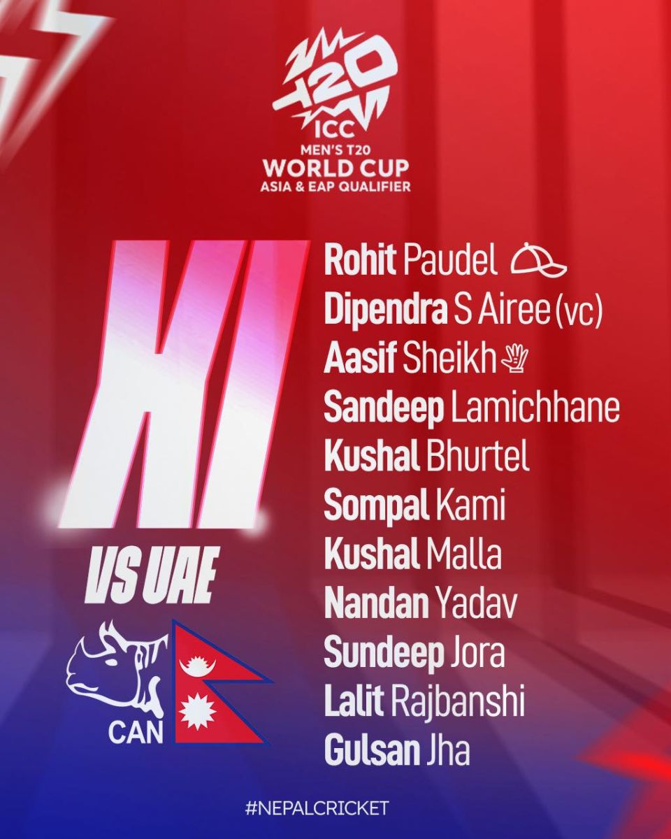 नेपालले लिग चरणमा जापानविरुद्ध मैदान उतारेको टोलीलाई नै निरन्तरता दिएको छ । रोहित पौडेलको कप्तानीमा रहेको नेपालको प्लेइङ सेटमा उपकप्तान दीपेन्द्रसिंह ऐरी र विकेट किपरमा आसिफ शेख छन् । कुशल भुर्तेल, कुशल मल्ल, सन्दीप जोरा, गुल्शन झा, सन्दीप लामिछाने, ललित राजवंशी, सोमपाल कामी र नन्दन यादव नेपालको प्लेइङ सेटमा परेका छन् ।