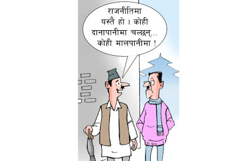 कार्टुनमा ‘राजनीतिमा यस्तै हो। कोही दानापानीमा चल्छन्...कोही मालपानीमा!’ लेखिएको छ। चुनावको समयमा उम्मेदवारका लागि अचानक लगानी गर्न आउने प्रवृतिलाई उनले ब्यंग्य गरेका हुन्।