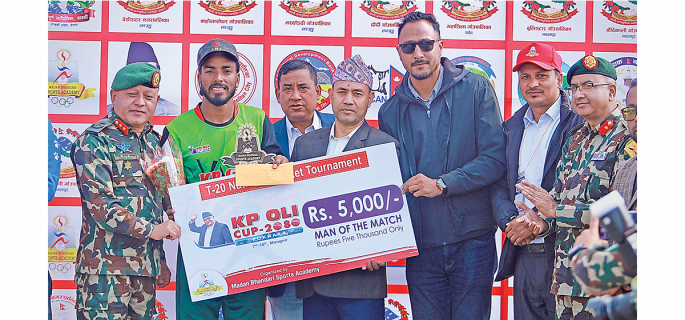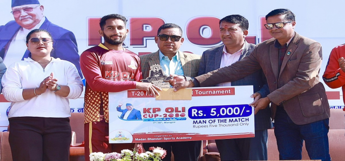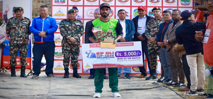 त्रिभुवन आर्मीलाई ११ रनले पराजित गर्दै मधेश प्रदेशले पोखरामा आयोजित केपी ओली टी–२० क्रिकेट प्रतियोगिताको उपाधि जितेको छ। टस जितेर व्याटिङ गरेको मधेश प्रदेशले त्रिभुवन आर्मीलाई १३६ रनको लक्ष्य दिएको थियो। मध्यम लक्ष्य पछ्याएको आर्मी भने ७ विकेटको क्षतिमा १२४ रनमा समेटियो।