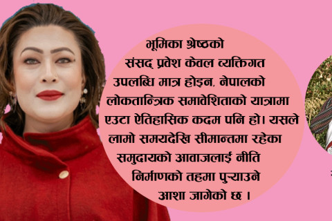 नि:सन्देह, पारलैङ्गिक समुदायका लागि यो गौरवपूर्ण उपलब्धि हो। तर यति महत्वपूर्ण उपलब्धिका बाबजुद पनि भूमिका श्रेष्ठको संसद् प्रवेशलाई उनको पहिचानसँग जोडेर, केवल पारलैङ्गिक भएकै आधारमा विवाद सिर्जना गर्ने प्रयास भइरहेको देखिन्छ।