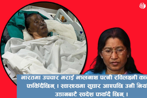 स्वास्थ्य लाभसहित पूर्वप्रधानमन्त्री झलनाथ खनालकी पत्नी रविलक्ष्मी चित्रकार स्वदेश फर्कँदैछन् । उनी भोलि (सोमबार) नियमित उडानबाट स्वदेश फर्कन लागेको खनालको सचिवालयले जनाएको छ ।