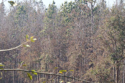दाङको तुलसीपुर उपमहानगरपालिका–३ स्थित नमूना महिला सामुदायिक वनमा सालका रूखहरू सुकेका जस्ता देखिन्छन्।