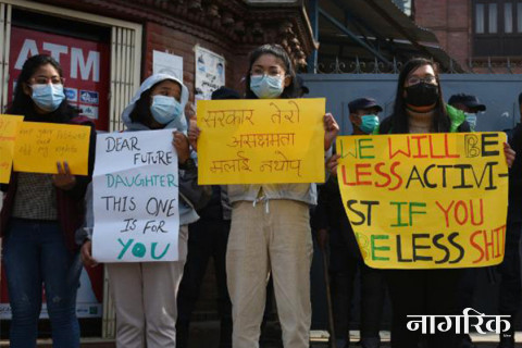 महिलाले विदेश भ्रमण जाँदा परिवार र स्थानीय तहको स्वीकृति लिनुपर्ने प्रस्तावविरुद्ध प्रदर्शन (फाेटाेहरू)