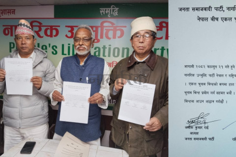 जसपा अध्यक्ष अशोक राई, राष्ट्रिय मुक्तिका अध्यक्ष राजेन्द्र महतो र नाउपा नेपालका अध्यक्ष रेशमलाल चौधरीबीच एउटै चुनाव चिन्ह लिएर प्रतिनिधिसभा निर्वाचनमा सहभागी हुने सहमति भएको हो ।