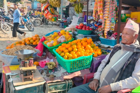 ठेलामा सजाइएका थरिथरिका फलफूल, खेलौना, बिस्कुट, चाउचाउ, कुरकुरे, बदामलगायत सामान धेरै छैनन्, तर ऐरका लागि ती नै परिवार धान्ने आधार हुन्।