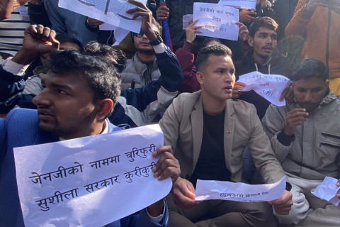 जेनजी अगुवा मिराज ढुंगानालगायतको टोलीले काठमाडौंको माइतीघर मण्डलामाधर्ना दिएका छन्।