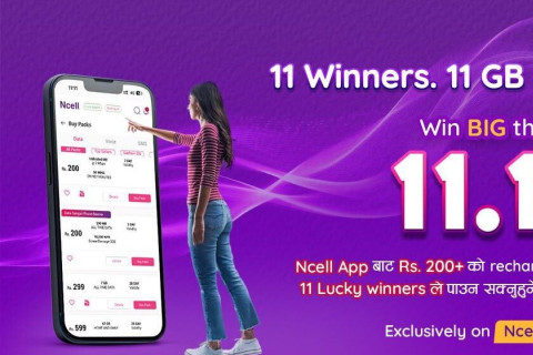 मंगलबारको दिन एनसेल एपमार्फत रु. २०० वा सोभन्दा बढीको प्याक खरिद गर्ने वा रिचार्ज गर्ने ग्राहकहरूमध्ये ११ जना भाग्यशाली ग्राहकले ११ दिन समयसीमा भएको ११ जीबी डेटा निःशुल्क पाउनेछन्।