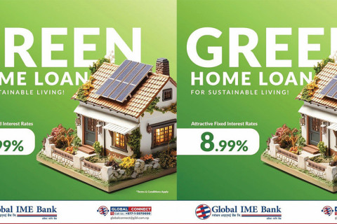ग्लोबल आइएमई बैंक लिमिटेडले ८.९९ प्रतिशत स्थिर ब्याजदरमा ग्लोबल ग्रिन आवास कर्जा योजना ल्याएको छ।
