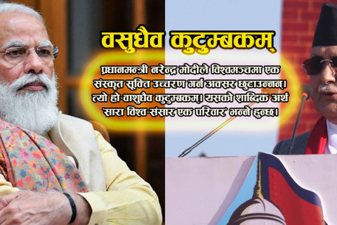 सन् २०१४ को लोकसभा निर्वाचनपछि भारतको सत्तामा आएका प्रधानमन्त्री नरेन्द्र मोदीले विश्वमञ्चमा एक संस्कृत सूक्ति उच्चरण गर्न अक्सर छुटाउन्नन्। त्यो हो–वसुधैव कुटुम्बकम्। यसको शाब्दिक अर्थ ‘सारा विश्व–संसार एक परिवार’ भन्ने हुन्छ।