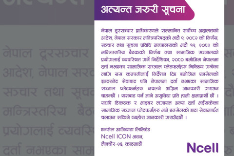 यद्यपि टिकटक र भाइबर लगायत अन्य दर्ता भईसकेका सामाजिक सञ्जाल प्लेटफर्महरु भने एनसेलको डाटा सेवामार्फत चलाउन सकिने एनसेलले जनाएको छ।