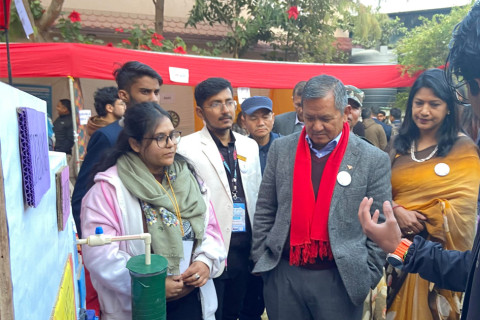 “मन्त्री ज्यू ! प्रविधिको प्रयोगले वाग्मतीको फोहर पानी पिउनयोग्य बनाउन सकिन्छ”, सञ्चार तथा सूचना प्रविधिमन्त्री पृथ्वी सुब्बा गुरुङलाई आफूले बनाएको नमूना देखाउँदै इन्जिनियरिङ सङ्कायमा अध्ययनरत विद्यार्थी भने।